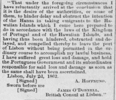 Eventually, local officials gave in. The Hansa set sail from Portugal on July 11th. The rest of the voyage was unremarkable. The ship arrived in Honolulu at the beginning of September.